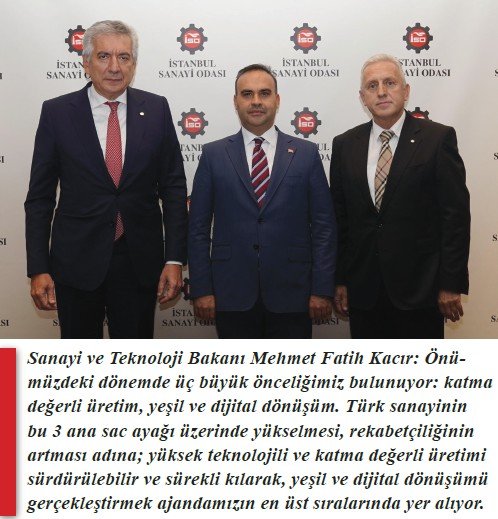İSO Meclis Toplantısında konuşan T.C. Sanayi ve Teknoloji Bakanı Mehmet Fatih Kacır, ““Dünyada uygulanan en etkin Ar-Ge teşvik sistemiyle ülkemizde adeta sıfırdan bir Ar-Ge ve inovasyon ekosistemi inşa ederek yüksek teknoloji ve katma değer üreten öncü Türkiye’nin temellerini attık. Önümüzdeki dönemde üç büyük önceliğimiz bulunuyor: katma değerli üretim, yeşil ve dijital dönüşüm. Türk sanayinin bu 3 ana sac ayağı üzerinde yükselmesi, rekabetçiliğinin artması adına; yüksek teknolojili ve katma değerli üretimi sürdürülebilir ve sürekli kılarak, yeşil ve dijital dönüşümü gerçekleştirmek ajandamızın en üst sıralarında yer alıyor” dedi.