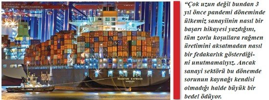 “Çok uzun değil bundan 3 yıl önce pandemi döneminde ülkemiz sanayiinin nasıl bir başarı hikayesi yazdığını, tüm zorlu koşullara rağmen üretimini aksatmadan nasıl bir fedakarlık gösterdiğini unutmamalıyız. Ancak sanayi sektörü bu dönemde sorunun kaynağı kendisi olmadığı halde büyük bir bedel ödüyor. Üstelik dünyadaki ekonomik durum da, biraz önce ifade ettiğim gibi bize maalesef dış pazarlara açılım ile toparlanma imkanı vermiyor. COVID döneminde bir başarı hikâyesi yazan, zor dönemlerde Türkiye'nin dünya markası, itibarı, toplumun ihtiyaçları noktasındaki çözümlerin en tartışmasız aktörü olan sanayinin aradan üç sene geçtikten sonra bu kadar kısa bir zamanda böyle bir açmazla karşı karşıya kalmasını, adeta en fazla hasar gören sektör olmamızı anlamamız kolay olmuyor.