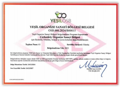 Çerkezköy OSB olarak, 2024 yılı sonunda hak ettiğimiz “Yeşil OSB” unvanımızla ilgili belgemizi bizzat Sanayi ve Teknoloji Bakanımızın elinden aldık. Bundan sonraki yıllarda da 40 adet Yeşil OSB kriterinin yıllar itibariyle gelişimini takip edip, raporlayarak belgemizi daha üst lige taşıma çabasındayız.