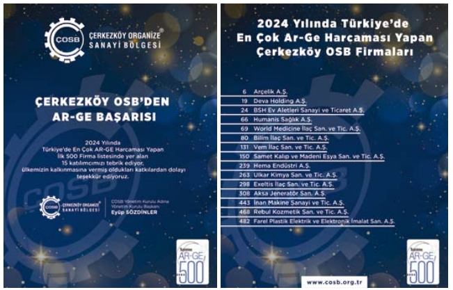 ÇOSB Yönetim Kurulu Başkanı Eyüp Sözdinler, yayınladığı mesajda Ar-Ge'nin ve inovasyonun ülke kalkınmasındaki rolüne dikkat çekti. Başkan Sözdinler, "Türkiye'de En Çok AR-GE Harcaması Yapan İlk 500 Firma listesinde yer alan 15 katılımcımızı tebrik ediyor, ülkemizin kalkınmasına vermiş oldukları katkılardan dolayı teşekkür ediyoruz," diyerek listedeki tüm ÇOSB firmalarını kutladı.