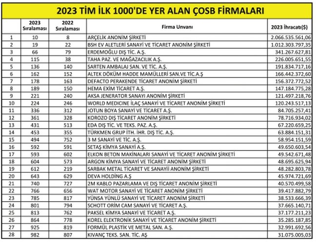 Türkiye İhracatçılar Meclisi (TİM) tarafından her yıl açıklanan ‘En Büyük 1000 İhracatçı 2023’ listesi yayınlandı. Çerkezköy Organize Sanayi Bölgesi’nden 28 firma listede yer aldı.
