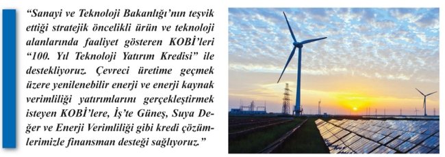 Çevreci üretime geçmek üzere yenilenebilir enerji ve enerji kaynak verimliliği yatırımlarını gerçekleştirmek isteyen KOBİ’lere; İş’te Güneş, Suya Değer ve Enerji Verimliliği gibi kredi çözümlerimizle finansman desteği sağlıyoruz.