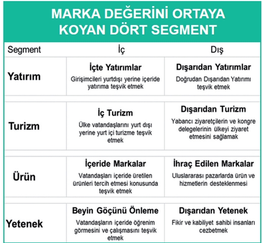 Ülkelerin ekonomik büyüklüklerinden doğan finansal marka değerlerinin yanı sıra, bu dört segmentten en yüksek puanı alan ülkenin markasının en güçlü olduğu kabul edilmektedir. Puanlama 100 üzerinden yapılmaktadır: