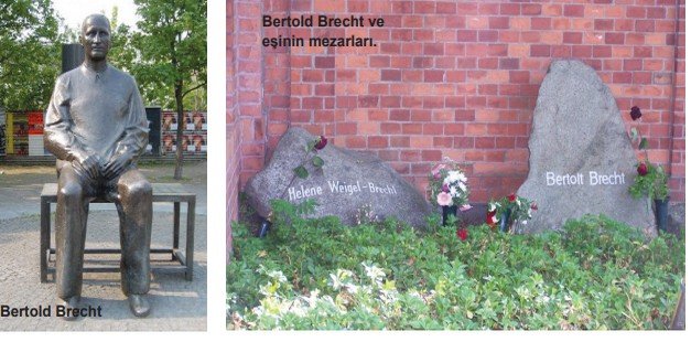 Berlin'i anlatan bir yazıda Bertold Brecht'ten söz etmeden geçilemez. Doğu Berlin'deki evi, penceresinden mezarlığı seyrettiği çalışma odası, tiyatrosu, tiyatronun kantini, heykeli, müze olan doğduğu ev... Hepsi çok ilginç...Tiyatroyu ve Brecht'in eserlerini sevenler için görülesi yerler... Brecht'in eserleri kadar kendi öz yaşam öyküsü de döneminin siyasi ve sosyal yaşamına paralel maceralar içeriyor. Sevgilileri, çocuk sahibi olduğu kadınlar ve eşleri, sürgün gittiği ülkeler, ilk oğlunu savaşta yitirmesi gibi travmalar da var... Madam Tussauds Mumya Müzesi'ndeki heykeli ise hoş bir müzecilik sergiliyor. Bir gözünün içine kamera yerleştirilmiş. Brecht'in karşısına geçince arkadaki ekrandan Brecht'in gözünden kendinizi görüyorsunuz. ”Acaba beni beğenir miydi, benimle sohbet eder miydi?” diye düşünmüştüm... Ama çok farklı zaman dilimlerinde bu dünyada bulunuyoruz. O, 1956'da göçmüş ben daha sonra dünyaya geldim... İlk kez Cesaret Ana ve Çocukları oyununu 19 yaşımda izlemiştim. Berlin'de tiyatrosuna gittim, kantininde bir şeyler içtim, heykelini, evini ve son eşi ile yan yana yattığı mezarını ziyaret ettim, fotoğrafladım.