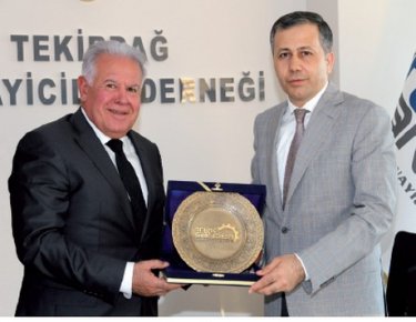 TEKSANDER Yönetim Kurulu Başkanı Ömer Sarıoğlu, Tekirdağ Valisi Ali Yerlikaya’ya ziyaret nedeniyle dernek logosunun kabartması bulanan bir plaket takdim etti.