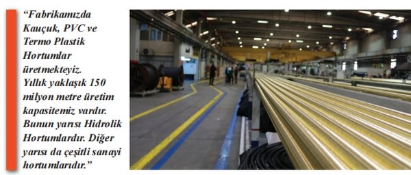 -Fabrikamızda Kauçuk, PVC ve Termo Plastik Hortumlar üretmekteyiz. Yıllık yaklaşık 150 milyon metre üretim kapasitemiz vardır. Bunun yarısı Hidrolik Hortumlardır. Diğer yarısı da çeşitli sanayi hortumlarıdır. Bugün fabrikamızda yaklaşık 1.800 kişi çalışmaktadır. Şirket merkezimizi de katarsak, bu sayı yaklaşık 2.000 kişidir. Şirketimiz, üretiminin yüzde 80’ini dünyada 80’den fazla ülkeye ihraç etmektedir.